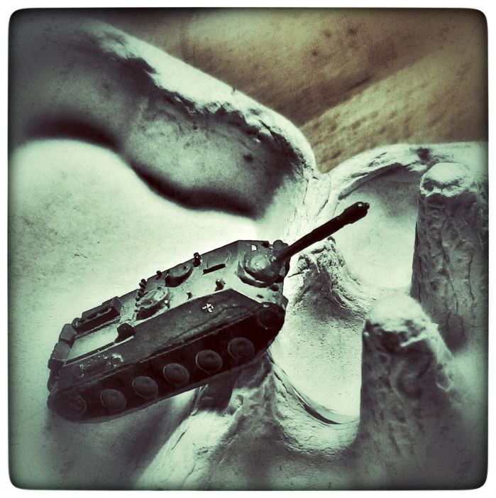 Panzerketten in Großaufnahme. Rasseln, Schnaufen...