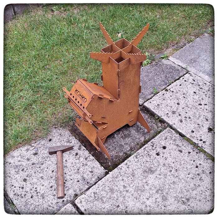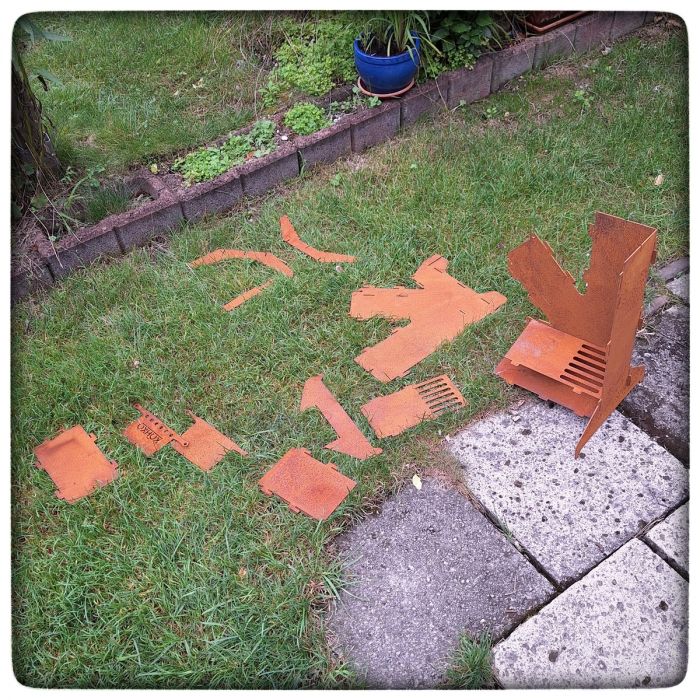 Das Eisenpuzzle vor mir ist so gestaltet, dass sich die einzelnen Teile - und es ist eine überschaubare Menge an Teilen - auf nur exakt genau eine Weise zusammenstecken lassen. Das erleichtert den Aufbau des Raketenofens entschieden.