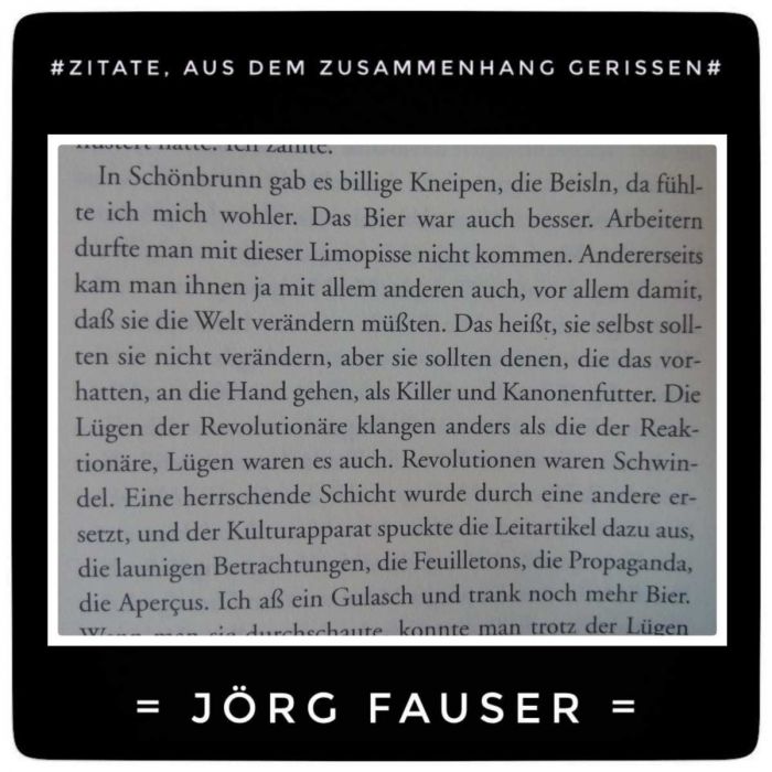 In Schönbrunn gab es billige Kneipen, die Beisln, da fühlte ich mich wohler. Das Bier war auch besser. Arbeitern durfte man mit dieser Limopisse nicht kommen. Andererseits kann man ihnen ja mit allem anderen auch, vor allem damit, daß sie die Welt verändern müßten. Das heißt, sie selbst sollten sie nicht verändern, aber sie sollten denen, die das vor hatten, an die Hand gehen, als Killer und Kanonenfutter. Die Lügen der Revolutionäre klangen anders, als die der Reaktionäre, Lügen waren es auch. Revolutionen waren Schwindel. Eine herrschende Schicht wurde durch eine andere ersetzt, und der Kulturapparat spuckte die Leitartikel dazu aus, die launigen Betrachtungen, die Feuilletons, die Propaganda, die Aperçus. Ich aß ein Gulasch und trank noch mehr Bier.