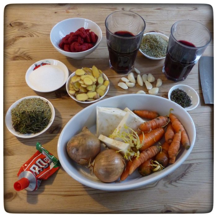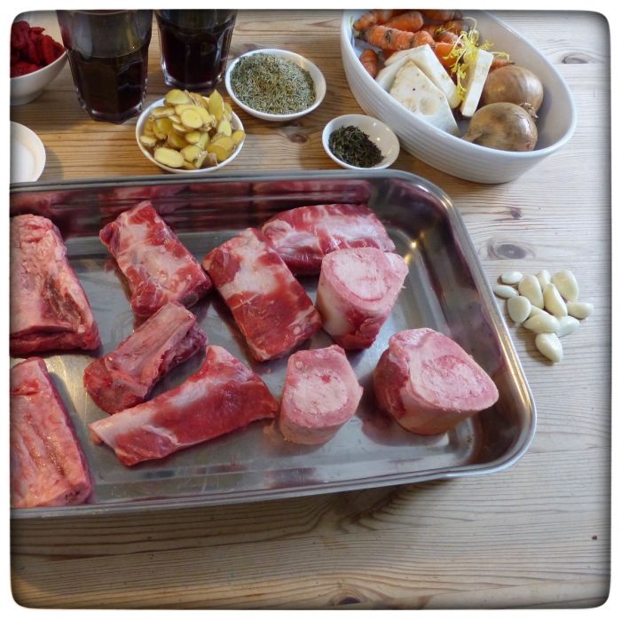 Zunächst geht es auf Einkaufstour. Auch wenn die Zutaten im großen und ganzen nicht sonderlich exotisch sind, wird kaum einer alles in ausreichender Menge in der heimischen Küche vorfinden. Knochen sind die wichtige Basis. Dazu besorgt man sich vom Metzger Geflügelknochen, Suppenknochen oder was er gerade im Angebot hat. Und wenn bei den Zutaten 40 Gramm Rosmarin oder 70 Gramm Ingwer stehen, dann ist das auch so gemeint.