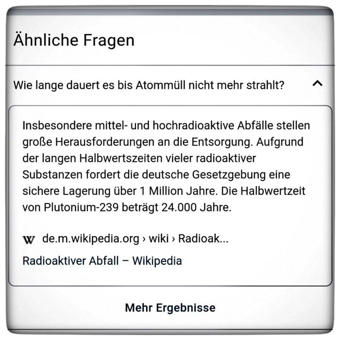 Warum das? Nun, eine Kunststofflasche ist nach 450 Jahren Geschichte. Eine Plastiktüte schon nach 20. Von so einem Brennelement ist nach 704 Millionen Jahren immer noch die Hälfte da und strahlt wie am ersten Tag.