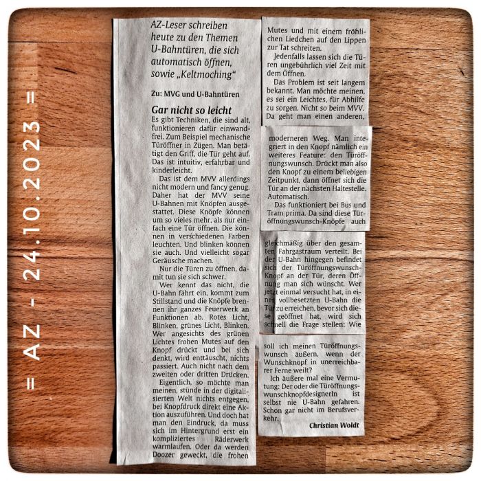 Das funktioniert bei Bus und Tram ganz prima. Da sind diese Türöffnungswunsch-Knöpfe auch gleichmässig über den gesamten Fahrgastraum - also jederzeit erreichbar - verteilt. Bei der U-Bahn hingegen befindet sich der Türöffnungswunsch-Knopf an der Tür deren Öffnung man sich wünscht. Wer jetzt einmal versucht hat, in einer vollbesetzten U-Bahn die Tür zu erreichen, bevor sich diese geöffnet hat, wird sich schnell die Frage stellen: Wie soll ich meinen Türöffnungswunsch äussern, wenn der Wunschknopf in unerreichbarer Ferne weilt?