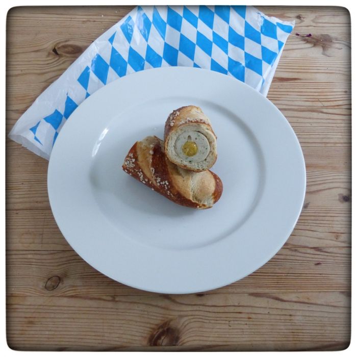 Und es gibt das Weißwurstfrühstück für Eilige. Also Wurst und Senf in ein Breznstangerl verpackt.