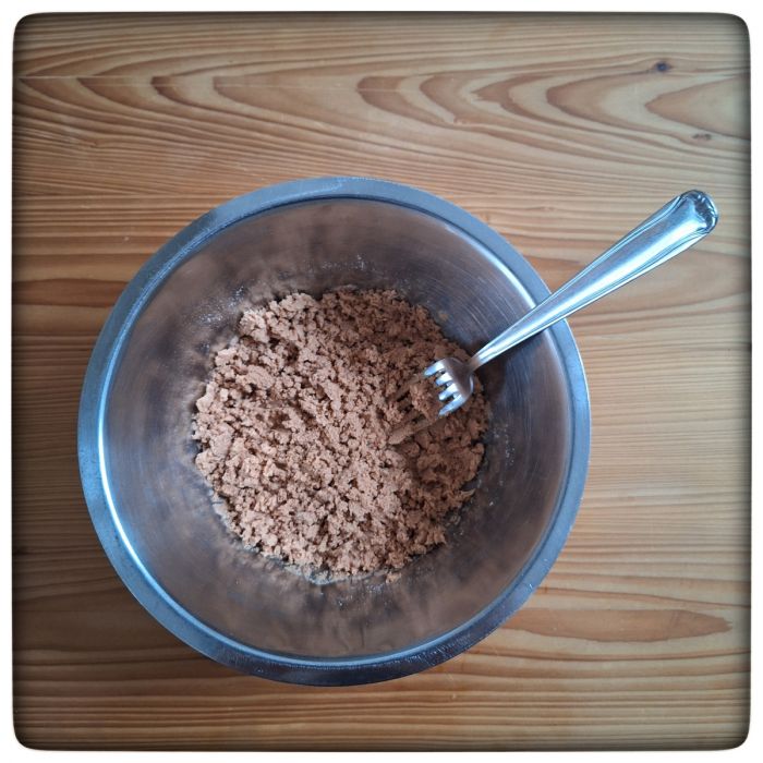 Dann verrührt man die Brösel mit dem Wasser. Dabei entsteht eine glatte, fast cremige Masse. Die Konsistenz erinnert tatsächlich an Leberkäsebrät.
