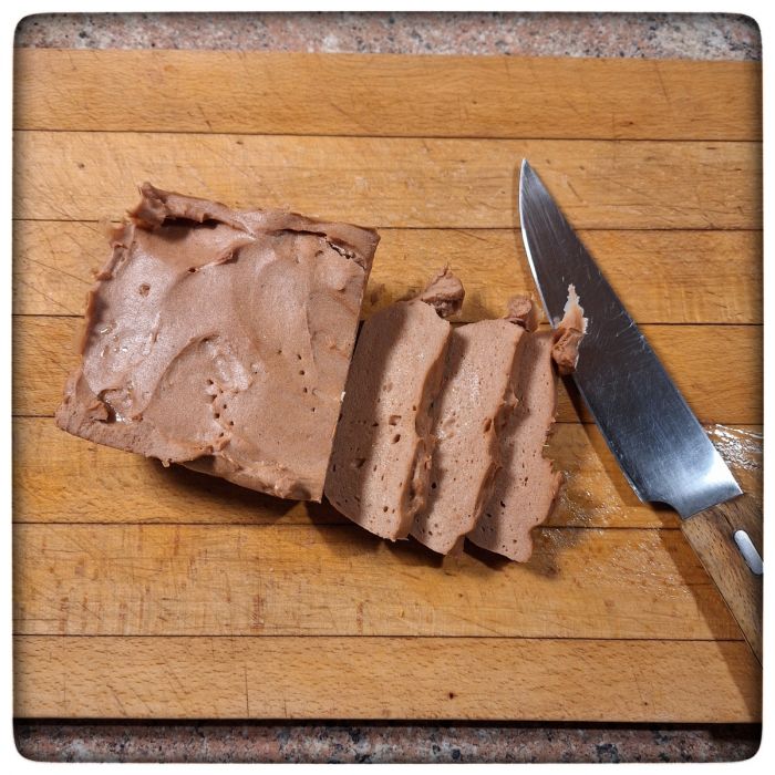 Ich bin ja experimentierfreudig. Auch in Sachen vegane Nahrungsmittel. Erbsenburger gibt es in ganz gut uns ganz greislich. Weißwurstersatzdinger sind ganz gruselig. Heute also Leberkäse.