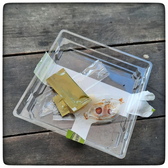 Einen Pferdefuß hat das Ganze auch. Einen ökologischen nämlich. Die aufmerksamen LeserInnen werden es längst gemerkt haben. Plastik... es fällt erstaunlich viel Plastikmüll an. Zumal Sojasosse, Wasabi, Ingwer und auch die Essstäbchen jeweils separat verpackt sind.