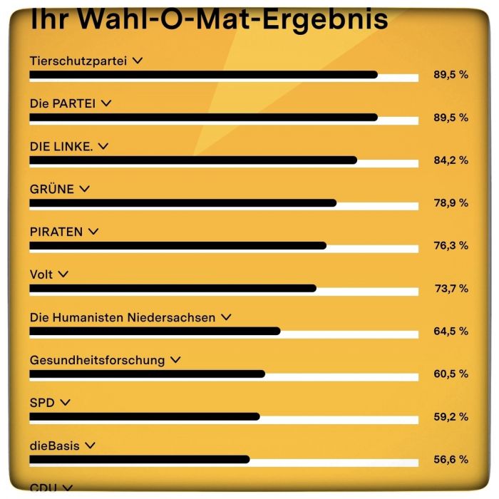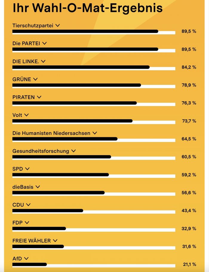 Weil ich mich auch in schwierigen Zeiten - und die Zeiten sind eigentlich immer schwierig - versichern möchte, ob die mir nahe stehenden Parteien mir immer noch nahestehen. Und ich bin immer wieder beruhigt, wenn das Ergebnis ein mir gefälliges ist. Selbst wenn ich den Wahl-o-Mat für eine Wahl mache, die mich so gar nicht betrifft. Zum Beispiel den Wahl-o-Mat für die Wahl in Niedersachsen 2022. In Niedersachsen gibt es Themen und Probleme, die sind einem Bayer so fern wie die Weißwurst dem Niedersachsen. Und doch...