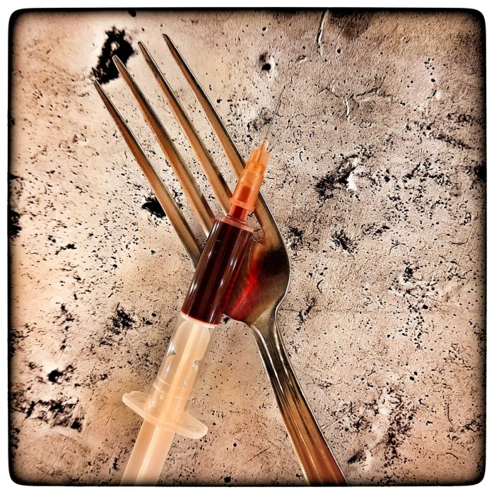 "Ja, habe ich. Sie ist ein Erbstück von meinem Großvater...." bitte behandeln sie sie vorsichtig, will ich noch nachschieben, da hat sie die Gabel schon ergriffen und mit einer Zange das Griffende abgezwickt. "Habe ich es mir doch gedacht, Hafer" und sie zieht den Inhalt der Gabel wie eine Schublade heraus. Fliegen stieben auf, ein unangenehmer Geruch macht sich breit. Ich vermeine auch Rauchwolken zu sehen, vielleicht ist es nur Staub. In der Schulbade sehe ich einen schimmeligen Rest Hafer. Und ich habe immer gedacht - besonders die alten - Gabeln währen massiv und nicht hohl. Dass man sich Material spart, indem man das Esswerkzeug mit Hafer ausstopft das war mir neu. Damit war der Grund für meine Beschwerden gefunden und ich begebe mich wieder ins Wartezimmer.