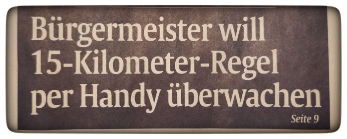 "Bürgermeister will 15-Kilometer-Regel per Handy überwachen" das liest sich, wie der feuchte Traum eines Möchtegerndiktators. Tatsächlich blubberte der Mist aus dem Mund eines christlich-sozialen Hinterwäldlers mit Profilneurose. Uwe Brandl, Präsidenten des Bayerischen Gemeindetages und Bürgermeister einer niederbayerischen Stadt (den Namen der Stadt nenne ich hier nicht, um die Stadt nicht in Misskredit zu bringen), ist der Urheber.