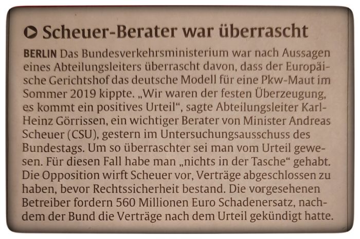 Dass der Herr Scheuer nicht die hellste Kerze am Baum ist, stellt er beängstigend regelmäßig unter Beweis. Jetzt stellt sich heraus, dass er obendrein von unfähigen Beratern umgeben ist. Gut, von einem unfähigen Minister kann man auch nicht so ohne weiteres erwarten, dass er fähiges Personal ran holt, aber so: "Wir waren der festen Überzeugung, es kommt ein positives Urteil." Das hat etwas von Realitätsverweigerung, von Parallelwelt. Wenn man sich nur konsequent genug von der Umwelt abschottet und sich gegenseitig intensiv genug versichert, Pudding an die Wand zu nageln ist eigentlich ein Leichtes... dann wird das schon irgendwie klappen.